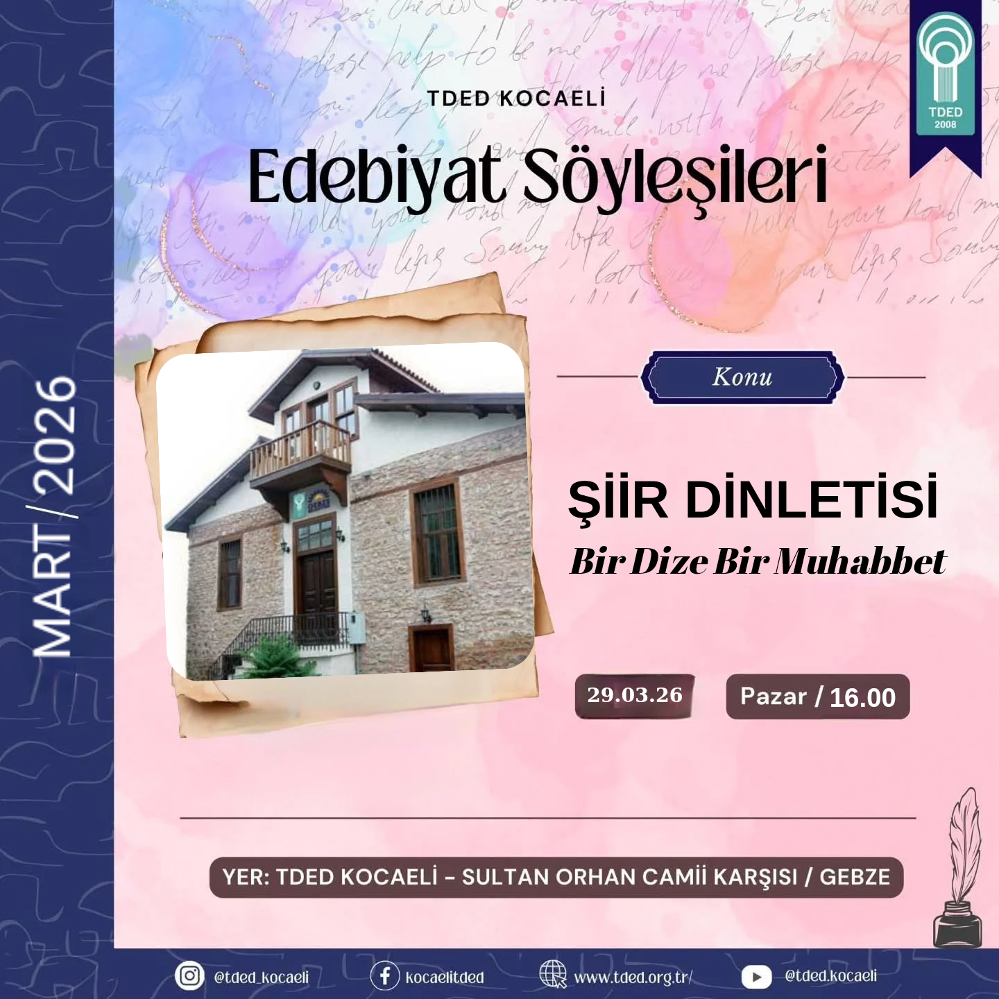 28/03/2026Tded Kocaeli olarak "Bir Dize Bir Muhabbet” temalı Şiir Dinletisi programımıza sizleri davet ediyoruz.