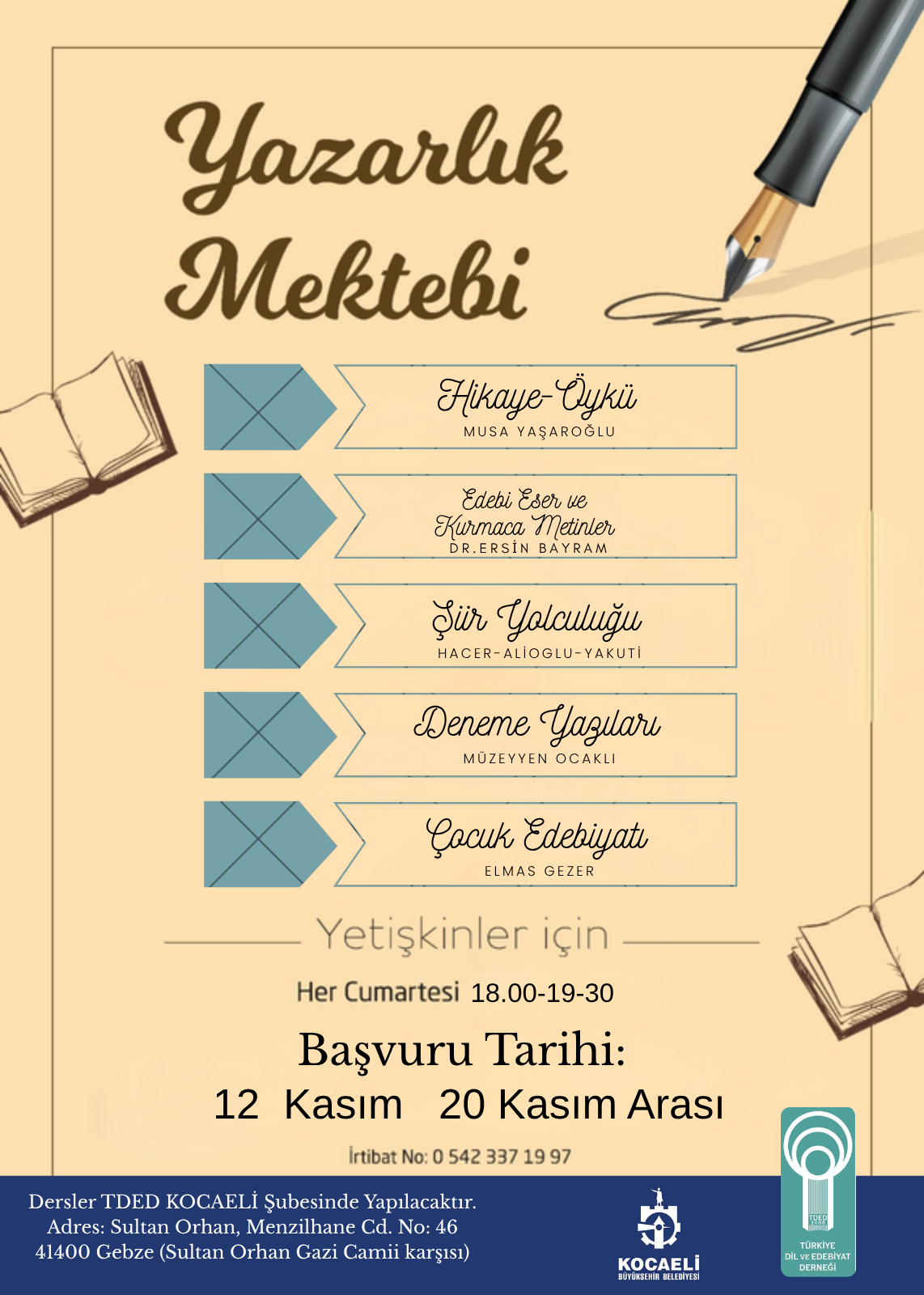 Yazarlık Mektebi programımıza kayıtlar başlamıştır! Yazma sanatını öğrenmek ve geliştirmek isteyen tüm yetişkinler davetlidir.